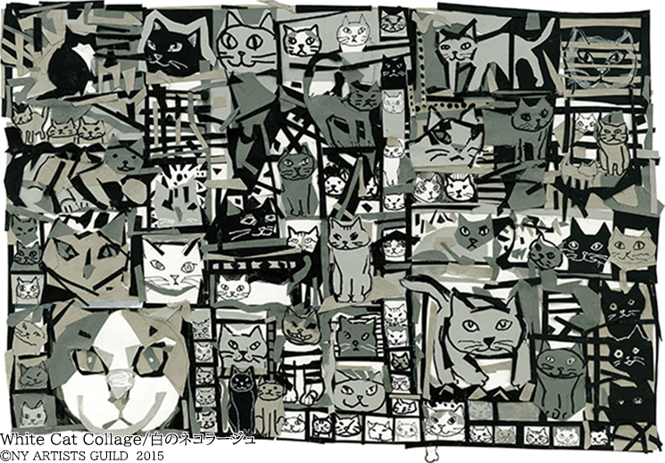 「Black Cat Collage/黒のネコラージュ」という作品と対で描かれました。どちらも切り張りのコラージュ作品です。ダンボール、布地、雑誌の切り抜きなど、いろいろな材料を、ハサミと糊を駆使して切り張り作業にいそしむとき、久下氏は画家というよりも職人に見えます。あるいはデザイナーか。不器用で、線をまっすぐに引くとか、きれいに紙を切り抜くなどは苦手なので、出来上がるコラージュ作品は精緻な仕事とはとても言えませんが、味わい深く、トリッキーで、巧みです。因みに猫の数は、79匹を数えます。