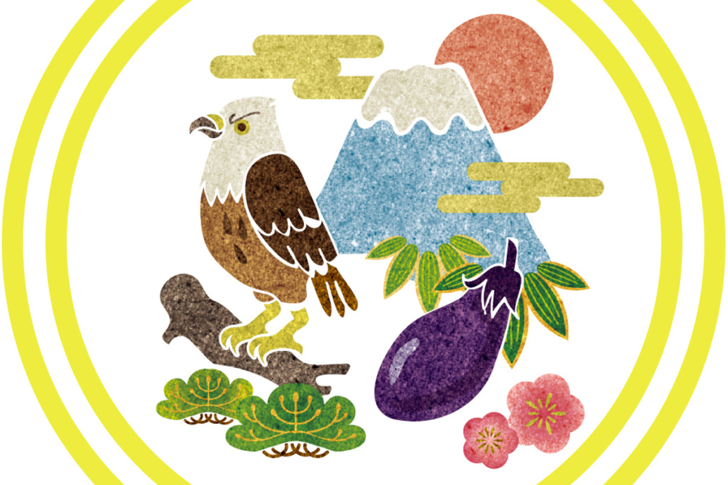 夢に見るもの、特に初夢に見ると縁起が良いとされるものを、めでたい順に並べた句。