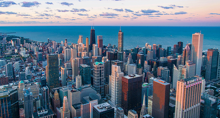 ①ビル群が上に伸びている