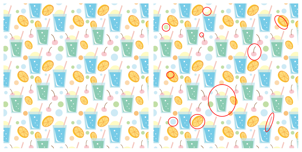 立体視の交差法を用いると、異なっている箇所が立体的に見えたりがちらついてみることができます。