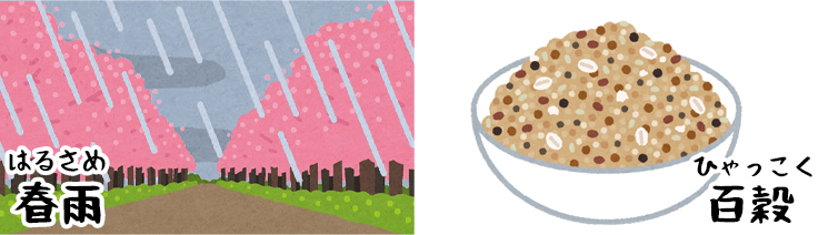 また今は穀物といえば米が主流ですが、昔はアワやキビ、ヒエなどを食べており、これら様々な穀物のことを「百穀(ひゃっこく)」といいます。