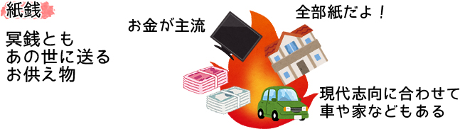 紙銭を焚き上げることにより祖先の元に届くと考えられており、天国でも生活に困らないようにという願いが込められています。