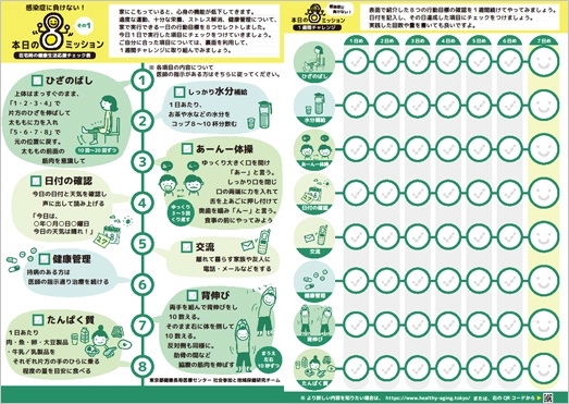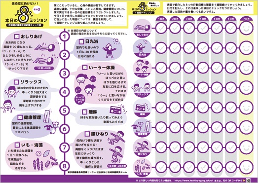 東京都健康長寿医療センター研究所 社会参加と地域保健研究チーム(ヘルシーエイジングと地域保健研究:テーマリーダー 北村 明彦)は、在宅での高齢者の健康づくりを応援する生活習慣チェック表として「本日の8ミッション」を公開しました。