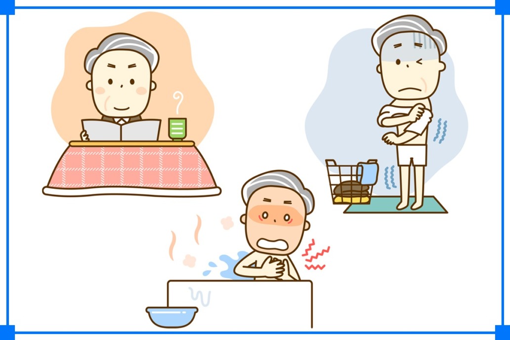 老化に伴う心肺機能の低下や自律神経の衰えで体温調節機能が働きにくくなっている場合、身体が急激な血圧の変化に耐えることができず、心筋梗塞・不整脈・脳梗塞などが起こりやすくなります。