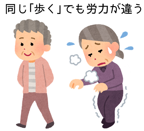 例えば、同じ「歩く」という行動に対して、杖などもなく歩ける場合もいれば、倒れないように必死に踏ん張って歩ける場合もあります。