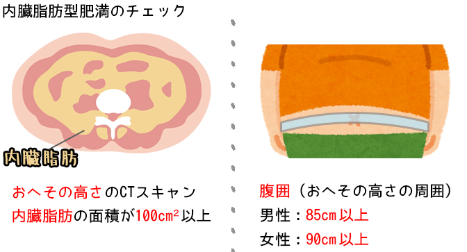 「内臓脂肪型肥満」はCTスキャンでおへその位置を測定した際、内臓脂肪の面積が100㎠以上だった場合に診断されます。