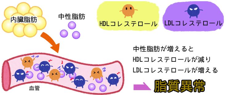 血中の中性脂肪が増加すると、良い働きをする善玉の「HDLコレステロール」が減少し、悪い働きをする悪玉の「LDLコレステロール」が増加します。