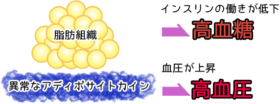 内臓脂肪が増えるとアディポサイトカインの分泌量に異常が発生し、糖質を調整するインスリンの働きが悪くなって『高血糖』になったり、血圧を上昇させてしまい『高血圧』になります。
