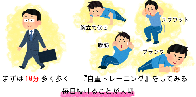 仕事などで十分に時間を作ることが難しい場合は、通勤時に10分多く歩くことから始めてみてはどうでしょうか。
