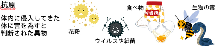 医学的には、この体内に侵入してきた害があるものを『抗原(こうげん)』といいます。