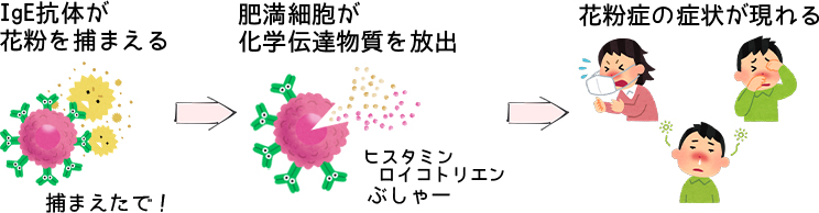 花粉を抗原と認識すると、今後侵入してきた時に対抗するために『IgE抗体(あいじーいーこうたい)』と呼ばれるたんぱく質が作られます。