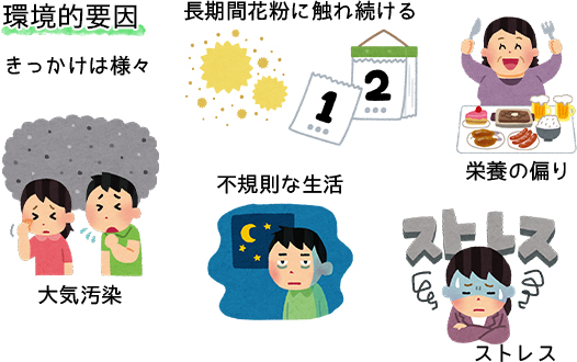花粉に長期間に渡って触れ続けたり、不規則な生活やストレスなどが原因で免疫機能のバランスが崩れていたりすると、花粉症を発症する可能性があります。