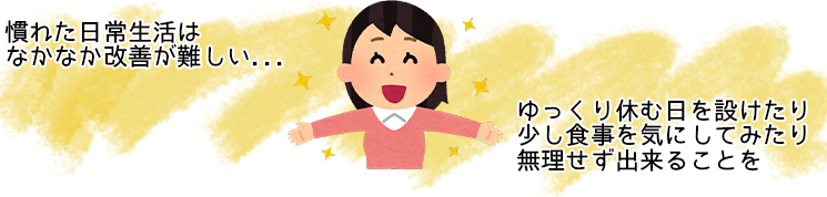 急に全てを改善することは難しいと思うので、まずはゆっくり休養を取ることから始めてみてはいかがでしょう。