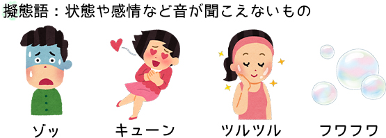 このような「状態や感情など音が聞こえるはずのないもの」を字句で表したものを『擬態語(ぎたいご)』といいます。