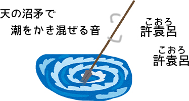 ~(省略)~ 其の沼矛を指し下ろして畫きたまへば、鹽許袁呂許袁呂に畫き鳴して、~(省略)~