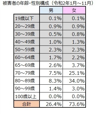 これを「特殊詐欺の被害者の年齢・性別構成」で見てみると、一般的に高齢者と呼ばれる65歳以上の割合は、男性は19.8%、女性は65.9%で、全体でみるとなんと85.8%になります。