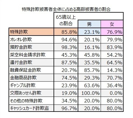 特殊詐欺被害者全体を今度は特殊詐欺の分類ごとに見たときの高齢被害者の割合は、オレオレ詐欺は94.6%、預貯金詐欺は98.3%、還付金詐欺は87.5%、キャッシュカード詐欺盗は96.7%と他の世代と比べて被害が圧倒的に多いことが分かります。