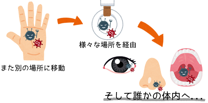 その細菌やウイルスが付着した手でどこかを触れば手から物体に移動しますし、風などの要因があれば手から飛ぶこともあります。