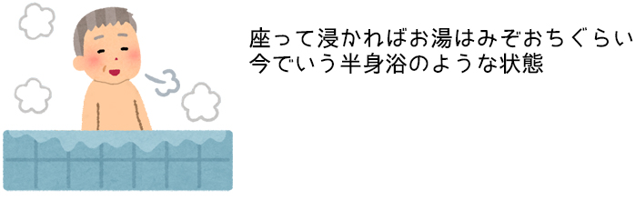 但しこの頃は従来の蒸し風呂に加えて、膝丈程度の湯に下半身を浸す「戸棚風呂」という半身浴のようなスタイルが一般的でした。