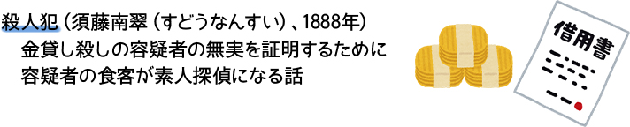 日本では1887年(明治20年)頃に海外の推理小説が初めて翻訳され、翌年には日本初の創作推理小説といわれている「殺人犯」を須藤南翠(すどうなんすい)が発表しています。