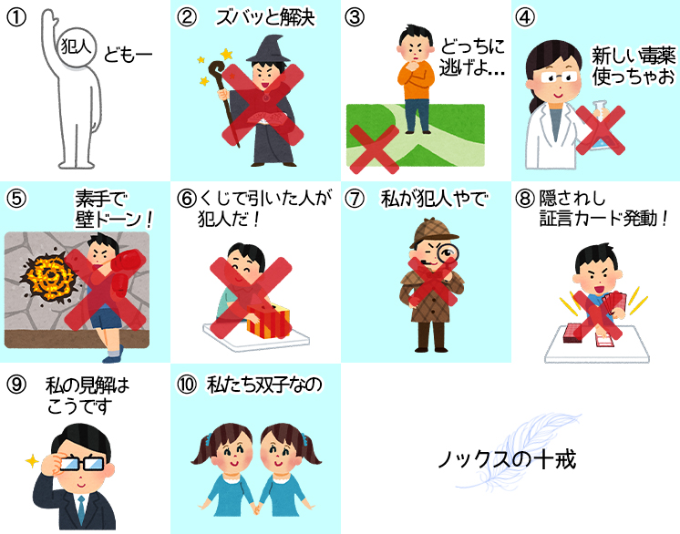 - 未発見の毒薬や難しい科学的な説明が必要な装置を犯行に使ってはならない
