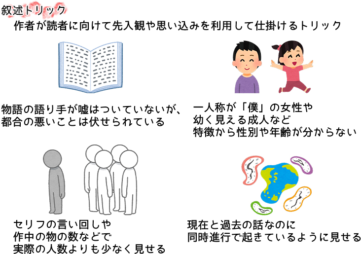 「小説で描かれる描写は正しく、そこから得られる情報も正しい」という前提条件を覆されるこのトリックには色んなパターンがあり、登場人物の名前の呼び方で同一人物や複数人を誤認させたり、特徴や話し方などで性別や年齢などを誤認させたりする「登場人物の誤認」。