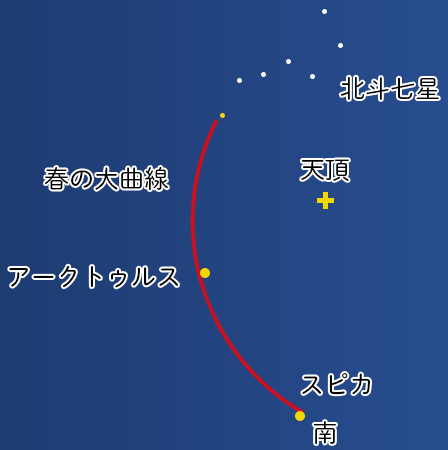 北斗七星の柄の部分の弓なりのカーブを延長していくと『春の大三角(はるのだいさんかく)』の一つである『うしかい座』のα星『アークトゥルス』を見つけることができます。