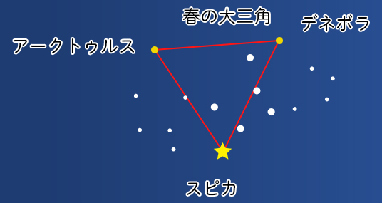 アークトゥルスとスピカに対して、正三角形になるように線を伸ばせば、しし座のβ星『デネボラ』を見つけることができ、春の大三角が完成します。