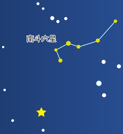 南斗六星はいて座の弓から上半身までの6つの明るい星で構成され、『北斗七星(ほくとしちせい)』と同じようなひしゃく型をひっくり返したような形をしています。