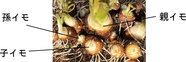 その後、親イモの周りを囲むように小さな塊茎が生じ、これを『子イモ(こいも)』と呼びます。