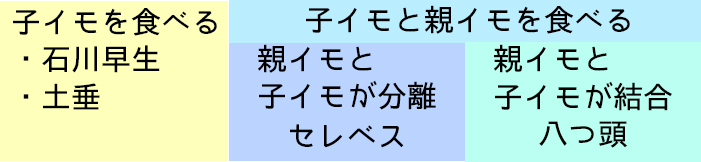 しかし、品種改良によって「親イモを食べる品種」「子イモを食べる品種」「親イモと子イモ両方を食べる品種」に分けられます。