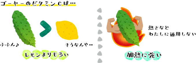 しかしゴーヤーのビタミンCは硬い皮の組織によって守られているため、加熱しても壊れにくいといわれています。