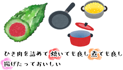 種を除くと中が空洞になるのでひき肉を詰めて、焼いたり、ロールキャベツのようにスープにしたりするのも良いですね。