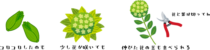 さらに、少し伸びたふきのとうも花や葉の部分を取り除いて茎の部分を食べることができますよ。