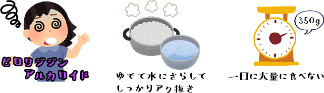 えぐみや苦みになる「ピロリジジンアルカロイド」と呼ばれる肝臓に悪影響を及ぼす成分を含んでいます。