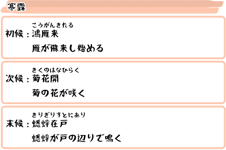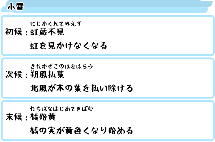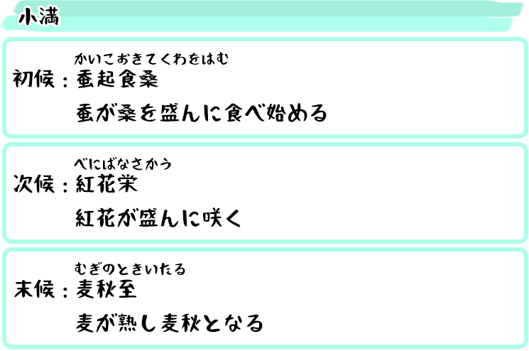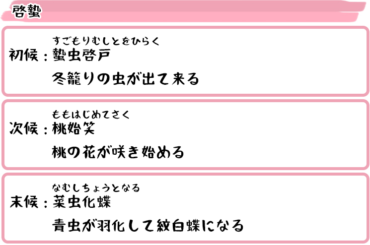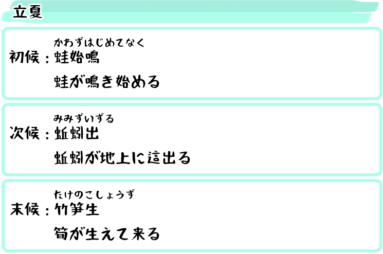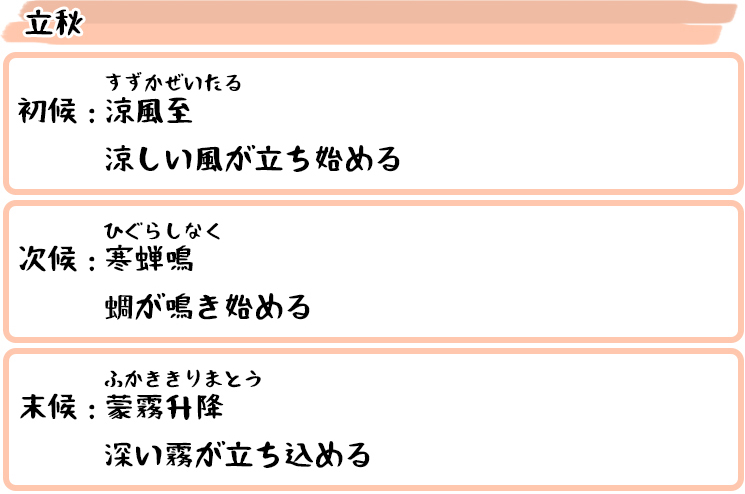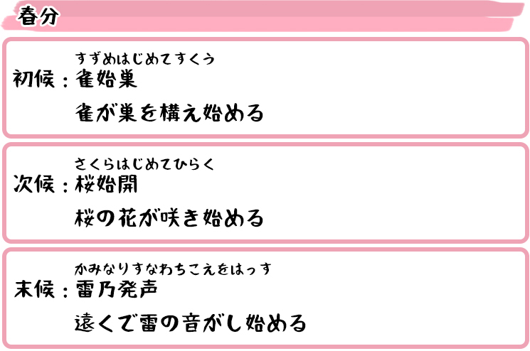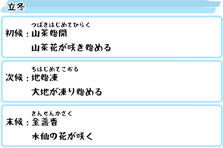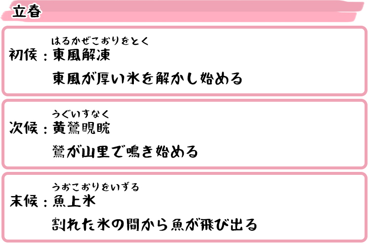 期間を1つの「気」とし、それぞれ「初候(しょこう)」、「次候(じこう)」、「末候(まっこう)」の3つに分けられた短文で構成されています。