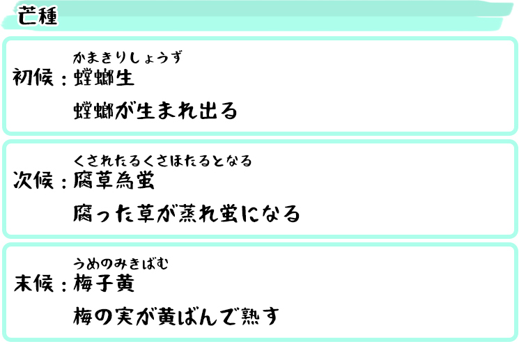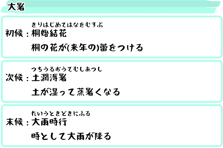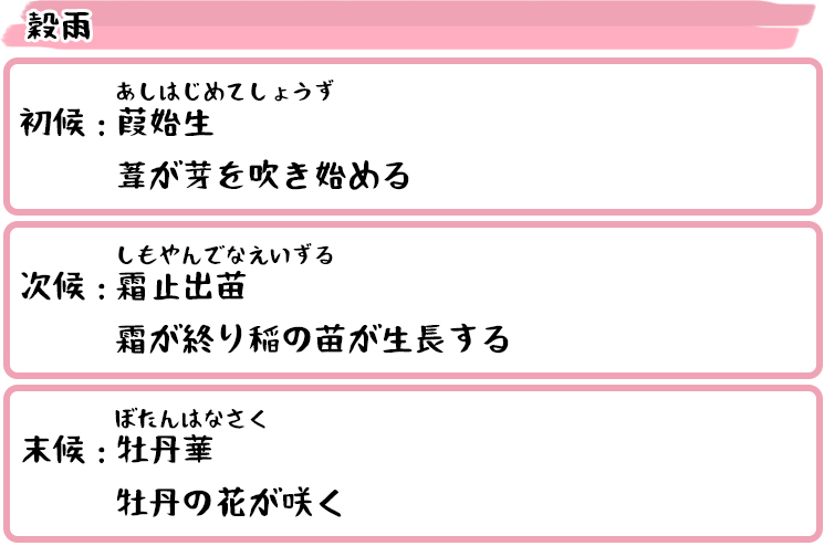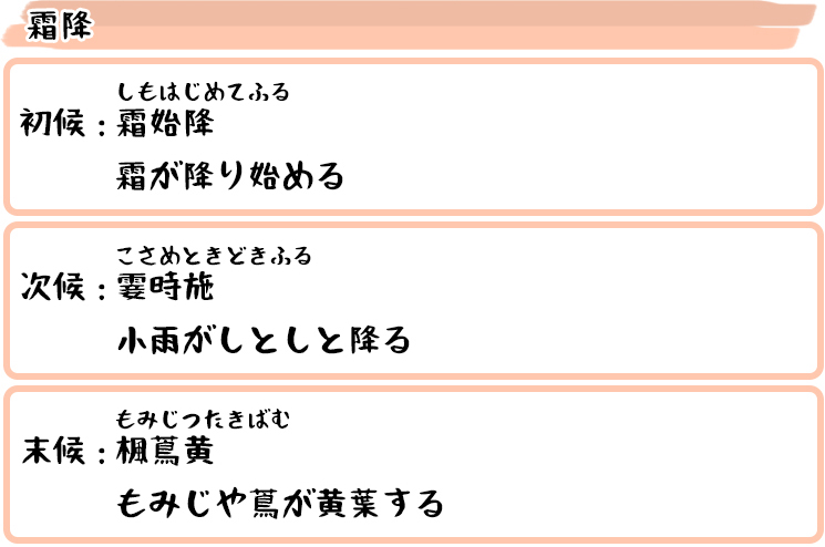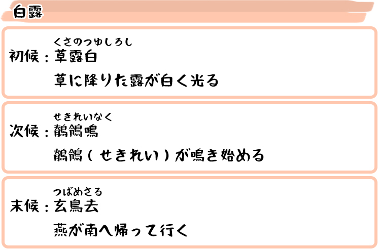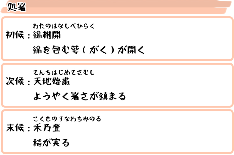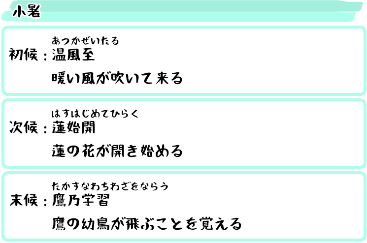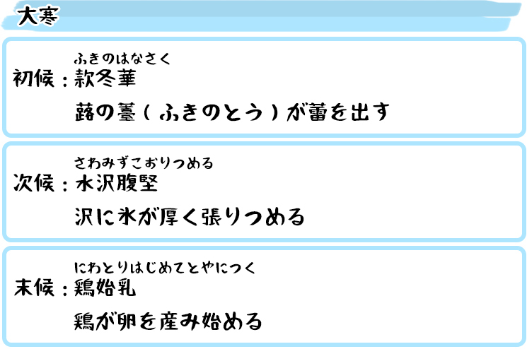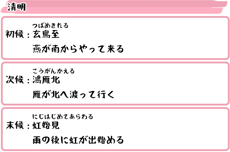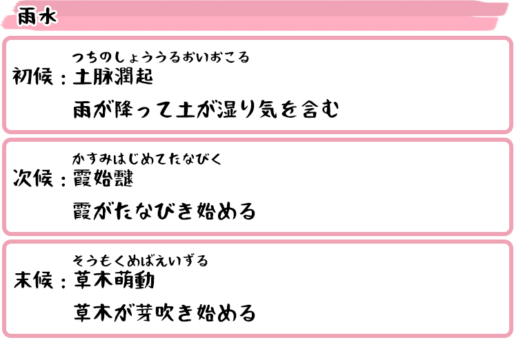 期間を1つの「気」とし、それぞれ「初候(しょこう)」、「次候(じこう)」、「末候(まっこう)」の3つに分けられた短文で構成されています。