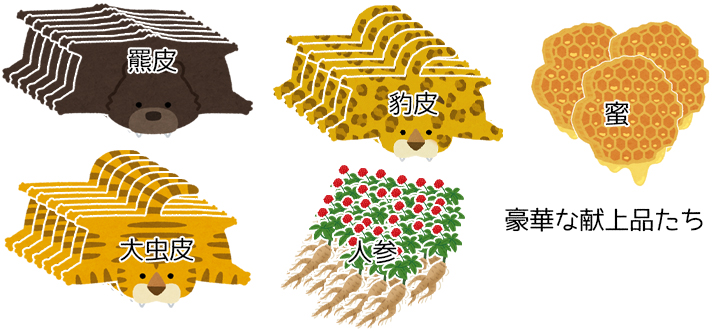 日本の対岸である「渤海国(ぼっかいこく)」から献上品として「大虫皮(虎皮)・羆皮各七張・豹皮六張・人参三十斤、蜜三斗」を差し出されたという記述があります。