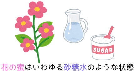 花の蜜は、ショ糖(砂糖の主成分)を含んだ約60%が水分の状態です。