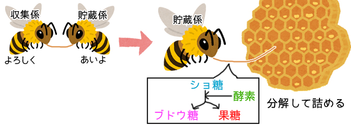 このとき、ミツバチの唾液に含まれている酵素がショ糖をブドウ糖と果糖に分解します。