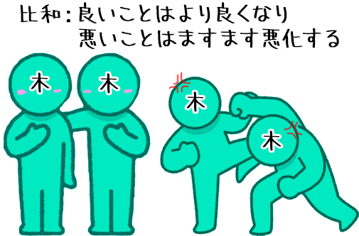 比和は「同じ気が重なる関係」のことで、同じ元素が集まることで強まる関係を表します。