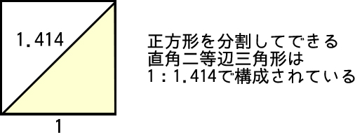 直角に接する辺を1とすると、正方形の対角線にあたる辺は1.414になります。