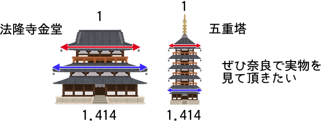 法隆寺金堂は2階と1階の屋根の長さ、五重塔は最上階と最下階の屋根の長さが1:1.414になっているのです。