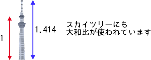 近年の建築物でも大和比は使われており「東京スカイツリー」の第2展望台までの高さと全長が1:1.414です。
