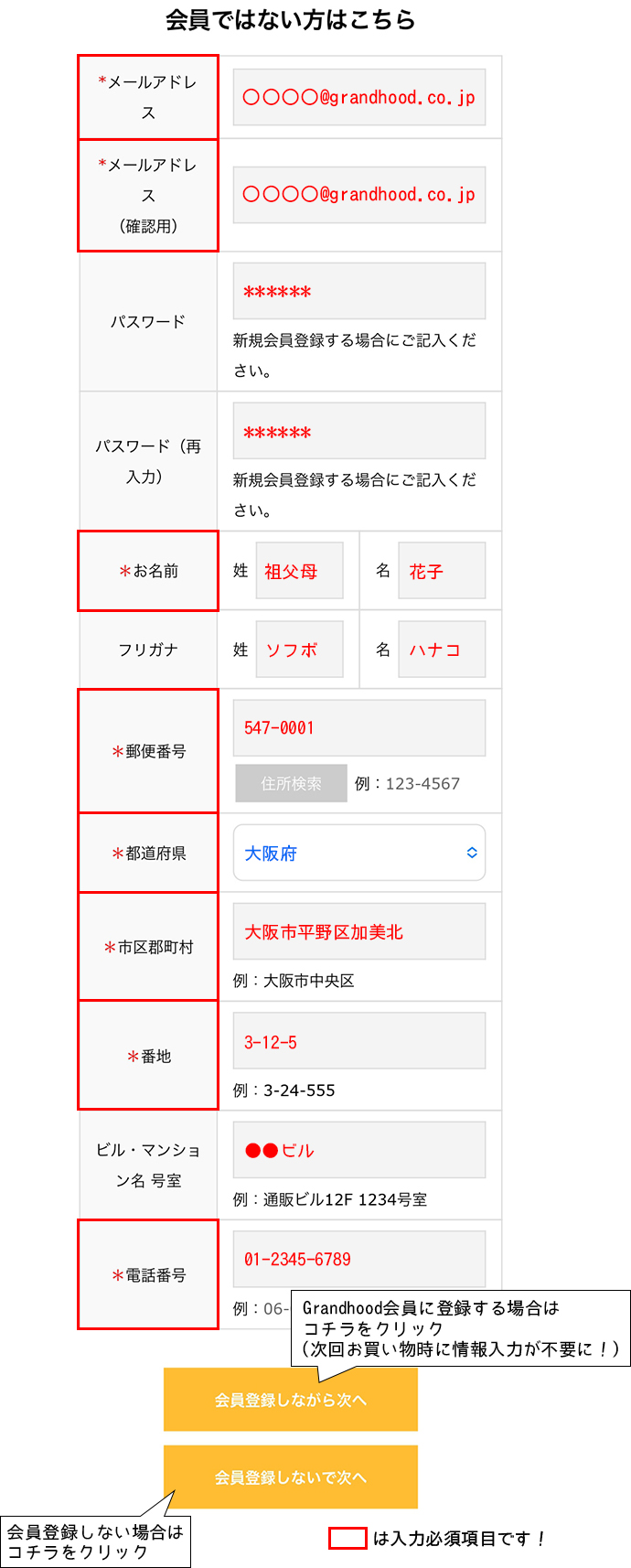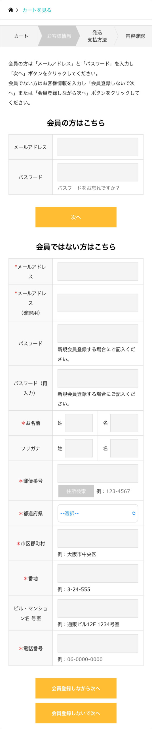 お名前、ご住所等を入力し「会員登録しないで次へ」または「会員登録しながら次へ」ボタンをクリックしてください。
