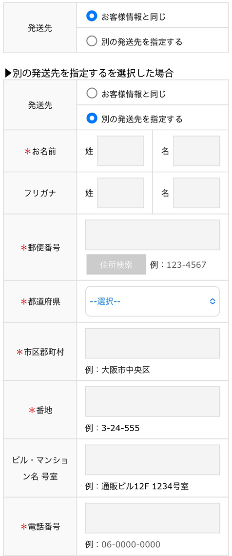 お客様情報とは別の発送先を指定する場合は「別の発送先を指定する」をクリックし、発送先情報を入力してください。