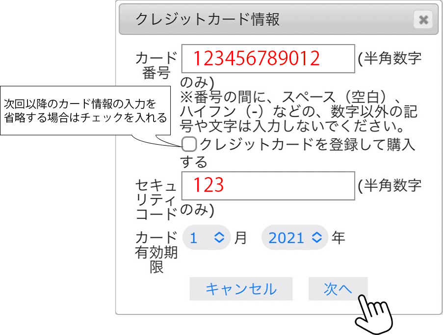 「クレジットカード」を選択された場合は「次へ」ボタンをクリック後にカード情報を入力してください。