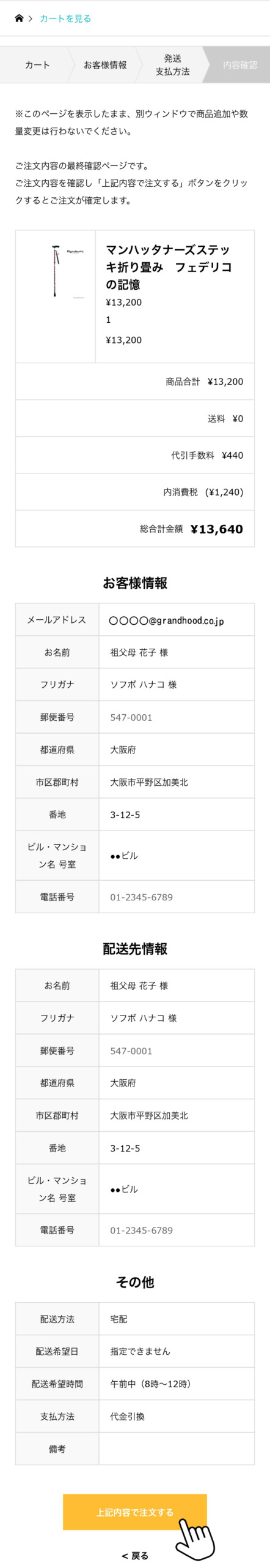 ⑤『内容確認』画面でご注文内容を確認していただき「上記内容で注文する」ボタンをクリックします。